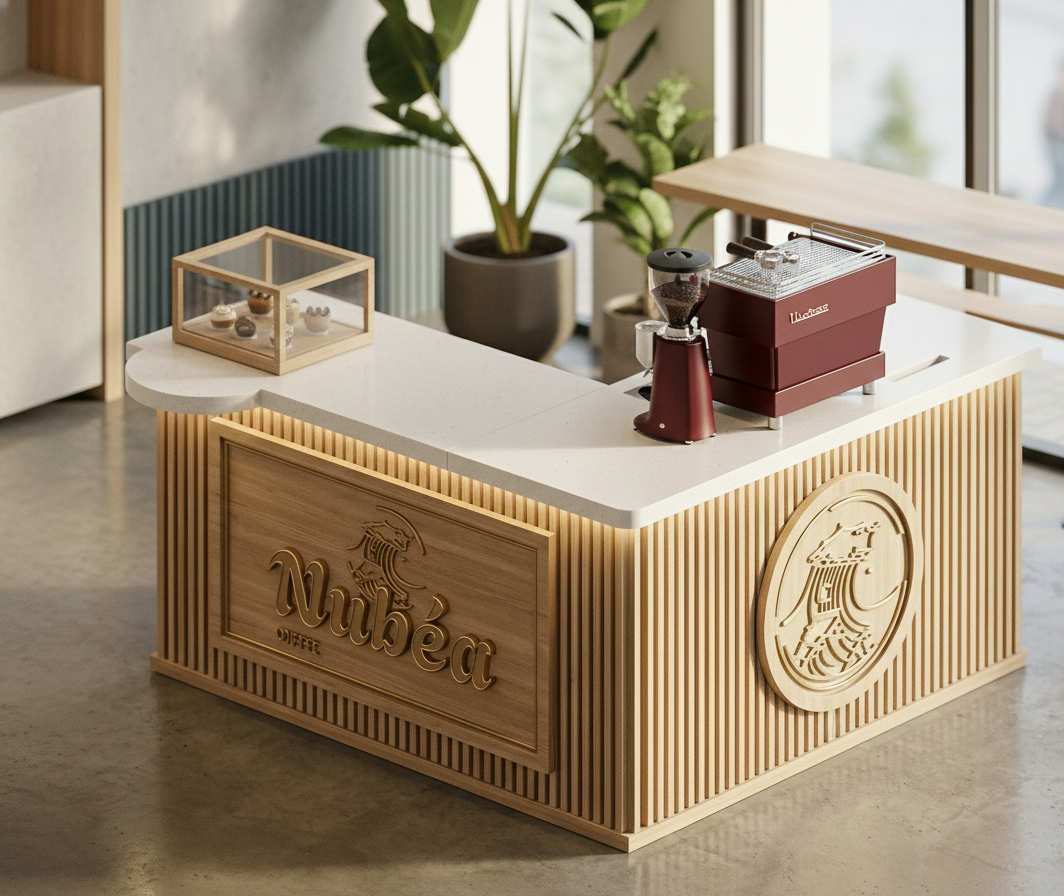 Pensée pour sublimer vos espaces, notre structure compacte allie l'efficacité d'un plan de travail professionnel à la chaleur de matériaux organiques (bois, beige, vert). Une présence visuelle forte, épurée et apaisante, qui transforme chaque service en une expérience premium.